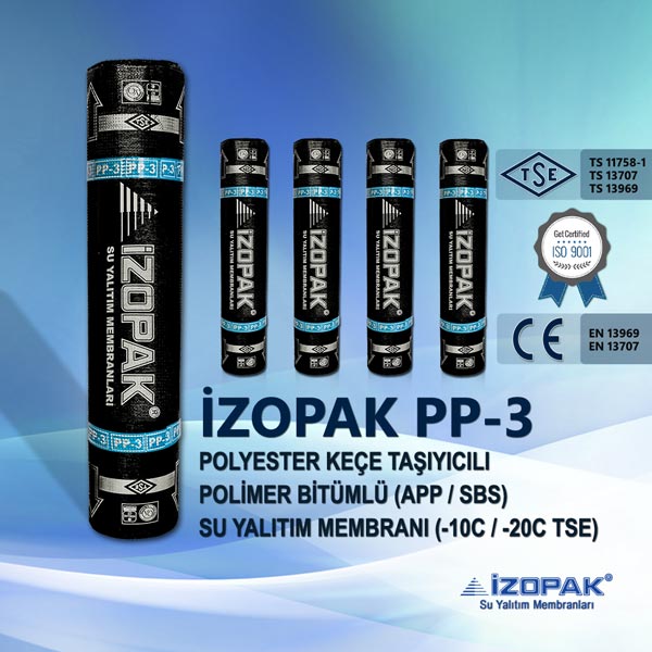 PP3 polyester keçeli bitümlü su yalıtım membranı , polyester keçenin APP (Atactic Polypropylene) katkılı bitum penetrasyon asfaltın kaplanması ile elde edilir. Her iki yüzü polietilen film kaplama ile kaplanan polyester keçeli membran son işlem ile elde edilir. PP3 polyester keçeli su yalıtım membranı genel olarak çatılarda, pergule ve su yalıtım izolasyonu gerektiren yalıtım noktalarında kullanır.